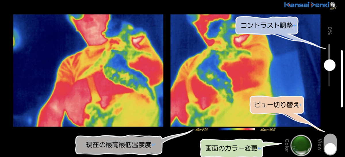 画像は 放射赤外線測定範囲の最高最低温度を基準とし、255諧調に変換したグレースケール画像で、環境の変化によりコントラストが変化します。
